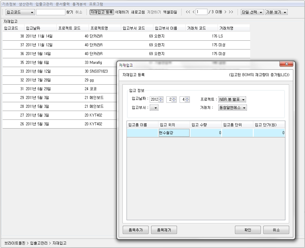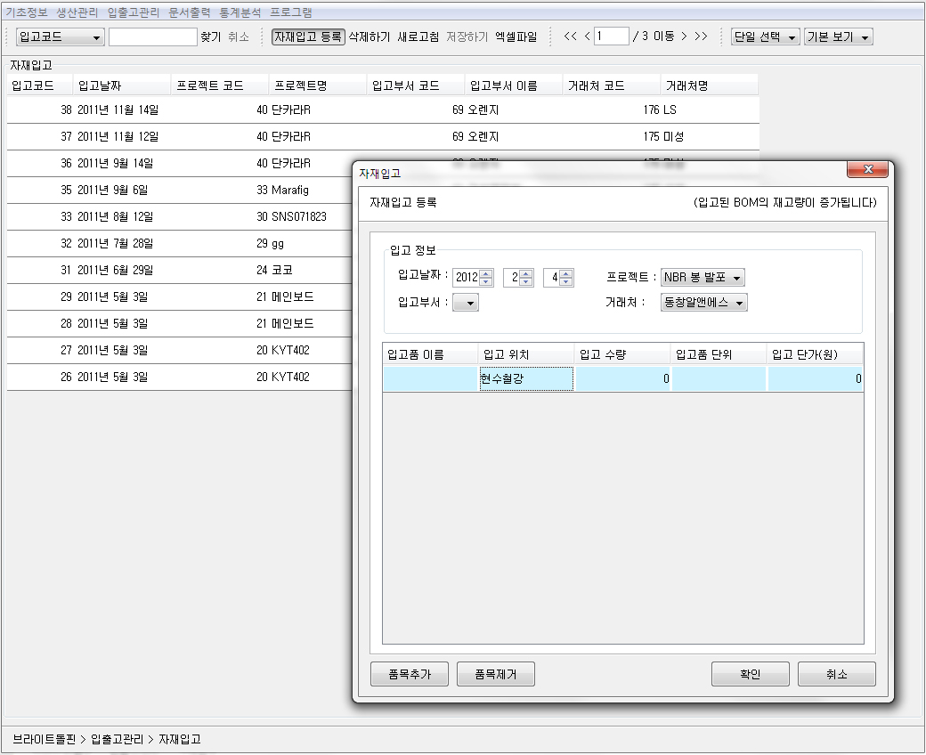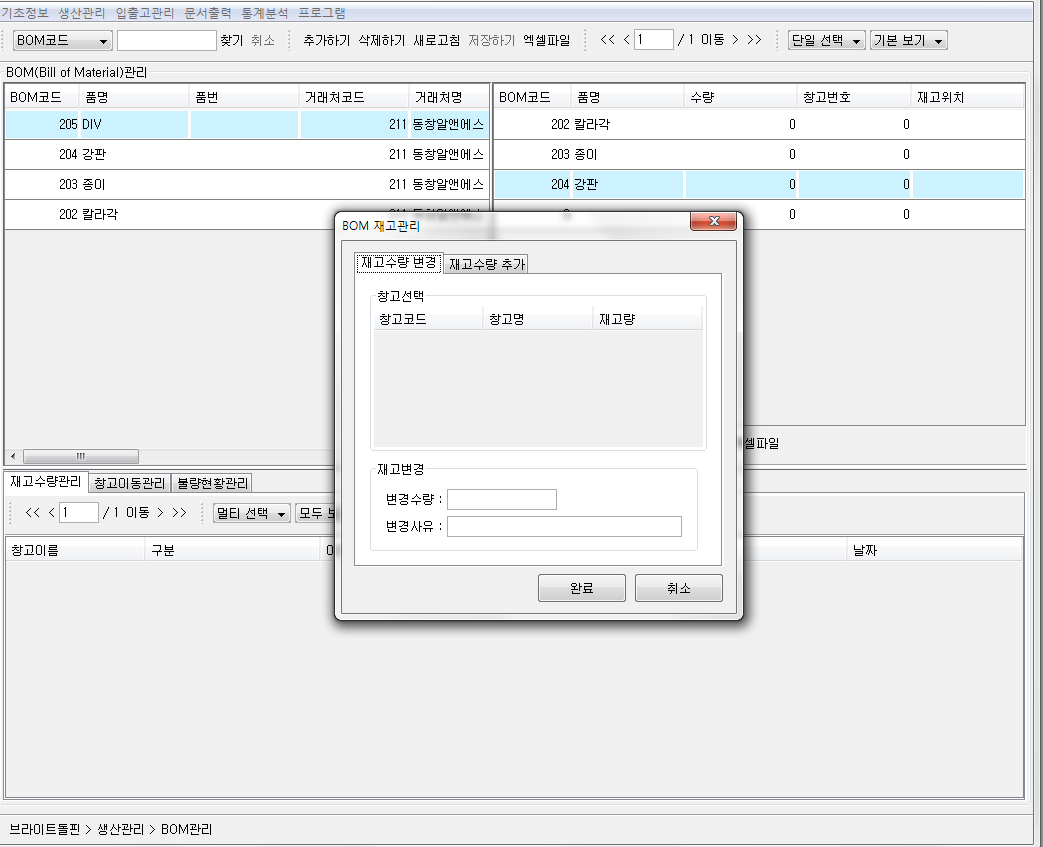 제조관리, 재고관리, BOM관리, 공정별 현황, 원재료, 부품관리, 생산원가계산, 자재소요량산출, 사원관리, 엑셀연동, 강력한 통계산출등의 기능을 포함하고 있습니다.